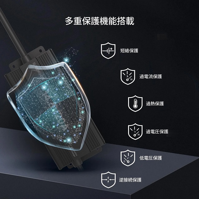 - 【安全保護機能内蔵】短絡・過熱・過電圧・低電圧・過電流・逆接続の6つの保護機能を搭載しています。インジケーターで充電状態を確認でき、バッテリーを総合的に保護できます。